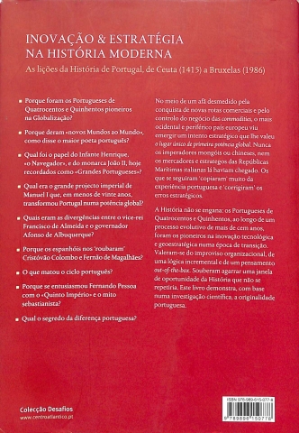A História não se engana: os Portugueses de Quatrocentos e Quinhentos, ao longo de um processo evolutivo de mais de cem anos, foram os pioneiros na inovação tecnológica e geoestratégica numa época de transição. Valeram-se do improviso organizacional, de uma lógica incremental e de um pensamento out-of-the-box. Souberam agarrar uma janela de oportunidade da História que não se repetiria. Este livro demonstra, com base numa investigação científica, a originalidade portuguesa.