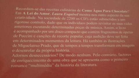 Recordam-se das receitas culinárias de Como Água Para Chocolate? Em A Lei do Amor, Laura Esquivel mostra-nos outro aspecto da sua criatividade. Na sociedade de 2200 os CD estão submetidos a um rigoroso controlo, dado que os indivíduos podem revisitar as suas vidas anteriores escutando determinadas peças de música. Assim, o livro é acompanhado por um disco compacto que contém fragmentos de óperas de Puccini e canções de recorte popular, cuja audição deve ser feita em determinados momentos da leitura. Há também as ilustrações de Miguelanxo Prado, que de tempos a tempos transformam em imagens o desenrolar da própria história.