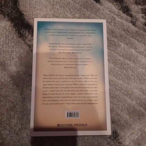 A vida de Allyson Healey que sempre foi planeada e organizada, muda no momento que conhece Willem, um ator de espírito livre, que a convida a ir com ele a Paris e a adiar todos os seus planos. Allyson não consegue resistir e decide acompanhá-lo, uma decisão inesperada que a leva a vinte e quatro horas de romance, liberdade e intimidade que irão mudar a sua vida. Apenas Um Dia é um romance que nos fala de amor, mágoa, viagens, identidade e das contingências provocadas pelo destino, mostrando que, por vezes, para nos encontrarmos a nós próprios, temos de nos perder primeiro...