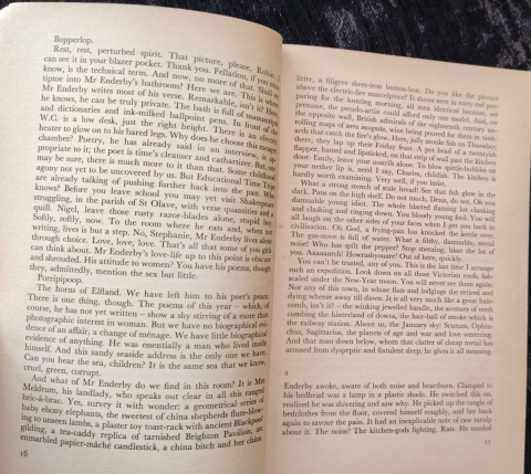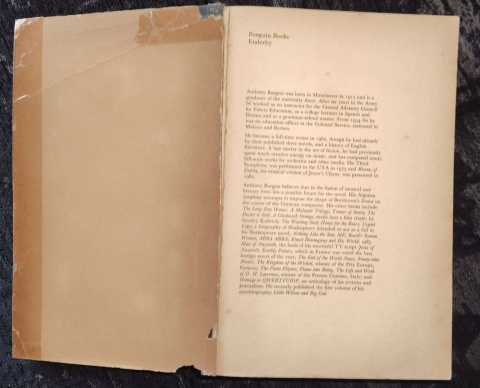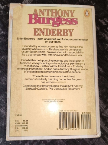 "The first sequel to Anthony Burgess’ Inside Mr. Enderby, Enderby Outside (1968) continues the story of would-be poet Enderby after his failed marriage and mental breakdown. When the book opens, he is working under an assumed name (Hogg) as a bartender in a chi-chi London hotel, where one evening a popular pop band holds a party. It turns out that the pop band, Crewsy Fixers, is backed by the former Mrs. Enderby, who has, moreover, stolen some of Enderby’s poems and had them published under the lead singer’s name.