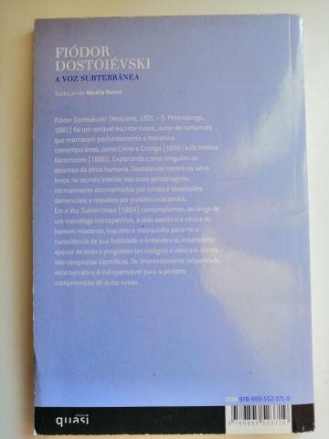 Pelo tom agreste, pelas cores sombrias até à repulsa, pela tensão quase raivosa das situações e da linguagem (aliás despojada dos floreios elegantes com que muitas traduções insistem em ornamentar os textos do autor) este Cadernos do Subterrâneo é «puro» Dostoiévski. Publicado em 1864 numa revista, este livro já prefigura as obras ditas maiores do autor, sendo por isso considerado um texto fundamental para a compreensão da obra de Dostoiévski. O livro tem duas partes: a primeira é um longo e violento monólogo (os «Cadernos»), em que o autor humilhado se humilha ainda mais, até à degradação; a segunda põe o herói em acção, ilustrando o confronto do seu ego degradado com as franjas da sociedade que vai encontrando. O «guincho ignóbil» (como disse Gorki) a que desceu este herói do nosso tempo é também a voz - embora guinchada e repulsiva - que passa por toda a obra de Dostoiévski: a da afirmação do direito à liberdade do indivíduo, seja quais forem os contornos que assuma.