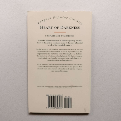 O romance narra a jornada de Marlow através do Congo, numa viagem de exploração colonial, explora os aspetos sombrios e perversos da natureza humana e do imperialismo, revelando a brutalidade e a crueldade que se escondem por detrás da máscara da civilização.