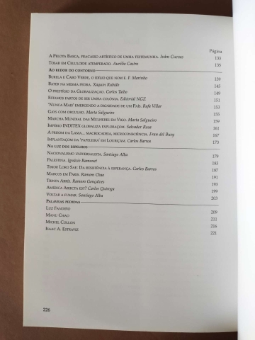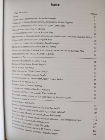Artigos inéditos de Bernardo Penabade, Camilo Nogueira, Carme Adán, Celso Á. Cáccamo, Gustavo Luca de Tena, Maurício Castro, Miguel Garcia, Raquel Miragaia, Rui Pereira, Santiago Alba e X. Antón Dobao.