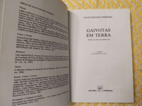 .... neste seu livro de estreia na ficção, David Mourão-Ferreira surge-nos, de chofre, igualmente senhor dos seus processos. Um mestre da técnica novelesca. Um mestre a sério, à escala universal. (...) Tudo isto numa Lisboa que cheira, que se palpa, que se entranha em nós, banal à superfície e interiormente densa de dramas suspensos e velados, de caladas agonias, de frustrações, de náusea sem ostentação. Aversão ao patético. Contenção. Ironia trágica. Lisboa da véspera de uma tempestade que não chega.... URBANO TAVARES RODRIGUES (in Diário de Lisboa, 31.XII.1959). «Gaivotas em Terra surge-nos como um dos mais impressionantes documentos do statu existencial do nosso tempo, da queda vertical do amor absoluto e até do seu ideal, da decadência do poder educativo e formativo da família, da insegurança do homem e da mulher quanto ao seu lugar, à sua substância e à sua recíproca dinâmica. ANTÓNIO QUADROS (in Diário Popular, 24.11.1960). «Tema supremo desta obra, seu sistema de estruturação, o Tempo entrelaça numa só narra-tiva romanesca estas quatro novelas de morte, de amor e de memória. (...) Do mais notável que a ficção portuguesa contemporânea nos tem apresentado. JOSÉ PALLA E CARMO (in Do Livro à Leitura, Publ. Europa-América, 1971, p. 225). É claro que, na posse destes fios subterrâneos, David Mourão--Ferreira poderia ter escrito um romance e poderia ter-lhe chamado Gaivotas em Terra. (...) Queremos apenas frisar que estas novelas possuem uma unidade subjacente, ao contrário de outros conjuntos de contos e novelas, dos mais diferentes autores. Gaivotas em Terra apresenta uma particularidade: um enraizamento lisboeta, um conhecimento sensorial digamos assim - da cidade, que só um lisboeta de gema poderia ter escrito esse livro. (...) São quatro excelentes novelas, narradas de quatro pontos de vista diferentes, como fomos assinalando. Quem sabe se o romance se tornou impossível devido precisamente a esse gosto de variação do ponto de vista do narrador? Seja como for, tal variação é ainda mais um valor a acrescentar à técnica e ao estilo do narrador. JOSÉ MARTINS GARCIA (in David Mourão-Ferreira Narrador, Ed. Vega, 1987, pp. 52-53).