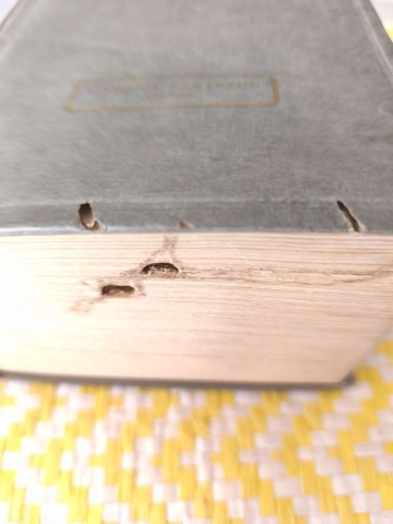 Exemplar com danos (buracos provocados por insectos) em algumas folhas no corte inferior que não atingem o texto.