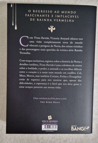 Com mapas exclusivos, registos sobre a história de Norta e detalhes inéditos, Trono Partido é uma coletânea de textos sobre a lealdade, o poder, a amizade e as escolhas difíceis entre o coração e a razão num mundo em conflito. Cal, Mare, Maven, mas também Coriane, Farley e Evangeline estão de regresso para nos mostrar que, apesar das dificuldades, a esperança é o farol que nos deve guiar e estar sempre presente nas nossas vidas.