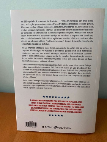 Dos 230 deputados à Assembleia da República, 117 estão em regime de part-time, acumulando as funções parlamentares com outras atividades profissionais no setor privado. Advogados, juristas, médicos, engenheiros, consultores, empresários, etc. Em diversos casos, prestando serviços remunerados a empresas que operam em setores de atividade fiscalizados por comissões parlamentares que os mesmos deputados integram. Ao que se acrescem as ligações a empresas (cargos de administração, participações acionistas, serviços de consultoria, etc.) que beneficiam de iniciativas legislativas, subsídios públicos ou contratos adjudicados por entidades públicas visando a execução de obras, o fornecimento de produtos ou a prestação de serviços. Conflitos de interesses? Dezenas de exemplos concretos são apresentados nas páginas deste livro. Dos corredores do poder político para as salas de reunião dos conselhos de administração, e demais órgãos sociais, das maiores empresas portuguesas, com ou sem período de nojo. Um fluxo recorrente entre cargos públicos e privados. Das 20 empresas cotadas no índice PSI 20, por exemplo, 16 contam com ex-políticos em cargos de administração. Por vezes são ex-governantes que decidiram sobre matérias que implicam as empresas para as quais vão depois trabalhar, ou até administrar. Sabia que as subvenções vitalícias dos políticos foram criadas numa altura em que Portugal estava sob assistência financeira do FMI? Que foram alvo de um veto presidencial? Que duplicam de valor quando o beneficiário alcança os 60 anos de idade? Que apesar de terem sido revogadas há 8 anos, o número de beneficiários continua a aumentar? Que a identidade dos beneficiários passou a ser secreta? Ou que há políticos que a requereram com idade inferior a 50 anos? Pedro Passos Coelho prometeu que iria fazer nomeações com base no mérito e não nas ligações partidárias. Apesar da maior transparência, as 142 nomeações com ligações partidárias para altos cargos dirigentes na Administração Pública, identificadas neste livro, demonstram que os boys continuam a ser favorecidos. O jornalista Gustavo Sampaio traz-nos um livro revelador, onde depois de uma exaustiva e rigorosa pesquisa, apresenta-nos as zonas cinzentas entre o interesse público e privado, e faz as ligações que nos permitem perceber como políticas e ex-políticos gerem interesses, movem influências e beneficiam de direitos adquiridos.