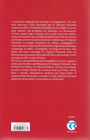 Este livro, correspondente aos Evangelhos do Ano A, regista o muito que foi dito e partilhado por D. Manuel Clemente, hoje Patriarca de Lisboa, a seu propósito. Em boa hora chega, porque é sempre tempo de se deixar tocar por Deus e de se fazer à estrada, deixando-se conduzir por Jesus e respondendo ao seu desafio para que mudemos o coração e a vida, abrindo-nos às suas palavras e ao seu amor - numa palavra, à Salvação!