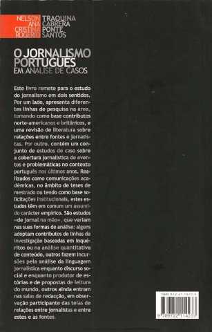 Este livro remete para o estudo do jornalismo em dois sentidos. Por um lado, apresenta diferentes linhas de pesquisa na área, tomando como base contributos norte-americanos e britânicos, e uma revisão de literatura sobre relações entre fontes e jornalistas. Por outro, contém um conjunto de estudos de caso sobre a cobertura jornalística de eventos e problemáticas no contexto português nos últimos anos.