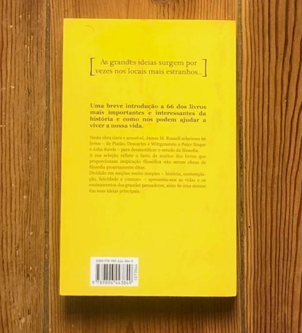 As grandes ideias surgem por vezes nos locais mais estranhos... Uma breve introdução a 66 dos livros mais importantes e interessantes da história e como nos podem ajudar a viver a nossa vida. Nesta obra clara e acessível, James Russell seleciona 66 livros - de Platão, Santo Agostinho e Descartes a Sartre, Saint-Exupéry e John Rawls - para desmistificar o estudo da filosofia. A sua seleção reflete o facto de muitos dos livros que proporcionam inspiração filosófica não serem obras de filosofia propriamente ditas. Dividido em secções muito simples - história, contemplação, felicidade e «ismos» - apresenta-nos as vidas e os ensinamentos dos grandes pensadores, além de uma síntese das suas ideias principais.