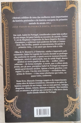Em 1526, Isabel de Portugal, considerada a mais bela mulher do seu tempo, foi para Castela ao encontro do marido, Carlos V, rei da Hispânia e imperador do Sacro Império Romano Germânico, o soberano mais poderoso de toda a Cristandade. Em Sevilha quando se encontraram, foi paixão à primeira vista e um amor que durou a vida toda dos dois. Filha de D. Manuel I, o Venturoso rainha e imperatriz pelo casamento, Isabel foi regente de Castela durante as prolongadas ausências do marido, a quem escrevia incansavelmente. Inteligente, sensível, apaixonada, mas de saúde frágil, desempenhou os vários papéis da sua vida - mulher, mãe e soberana - de forma exemplar. A morte, que a colheu ainda jovem, aos 36 de idade, precipitou Isabel de Portugal no esquecimento geral durante séculos. Apenas a lenda guardou o seu registo. E a arte. Um dos seus retratos - verdadeira obra-prima de Ticiano - é das raras referências que todos, ou quase todos, conhecem.