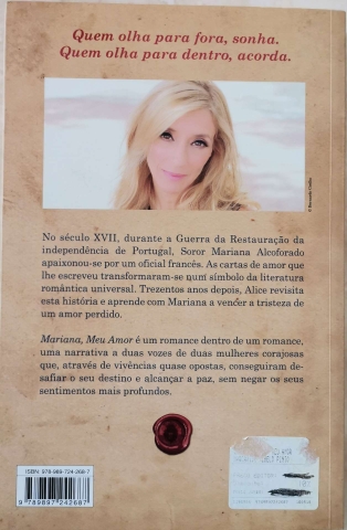 No século XVII, durante a Guerra da Restauração da independência de Portugal, soror Mariana Alcoforado apaixounou-se por um oficial francês. As cartas de amor que lhe escreveu transformaram-se num símbolo da literatura romântica universal. Trezentos anos depois, Alice, uma jornalista, revisita esta história e aprende com Mariana a vencer a tristeza de um amor perdido. Mariana, meu amor é um romance dentro de um romance, uma narrativa a duas vozes de duas mulheres corajosas que, através de vivências quase opostas, conseguiram desafiar o seu destino e alcançar a paz, sem negar os seus sentimentos mais profundos.