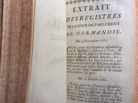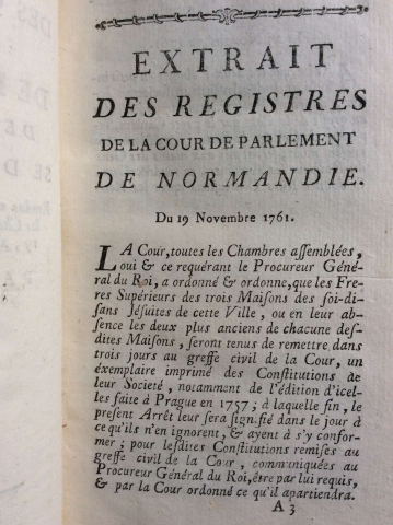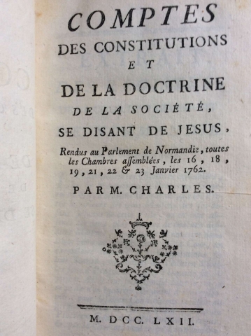 Comptes des Constitutions et de la Doctrine de la Société, se Disant de Jésus, Rendus au parlement de Normandie, toutes les Chambres assemblées, les 16, 18, 19, 21, 22 & 23 Janvier 1762