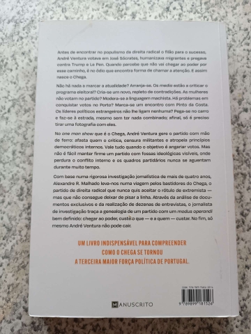 Com base numa rigorosa investigação jornalística de mais de quatro anos, Alexandre R. Malhado leva-nos numa viagem pelos bastidores do Chega, o partido de direita radical que nunca quis aceitar o rótulo de extremista - mas que não consegue deixar de pisar a linha. Através da análise de documentos exclusivos e da realização de dezenas de entrevistas, o jornalista de investigação traça a genealogia de um partido com um modus operandi bem definido: chegar ao poder, custe o que - e a quem - custar. no fim, só mesmo André Ventura não pode cair.