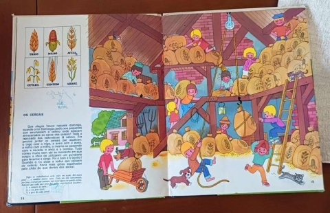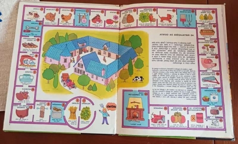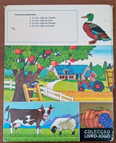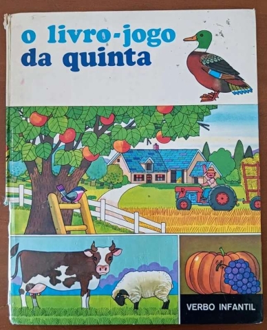 Livro infantil anos 1980 “O livro-jogo da quinta”. Livro ilustrado interativo com atividades e cenas da vida na quinta, com desenhos coloridos típicos da época — ideal para crianças ou colecionadores.
