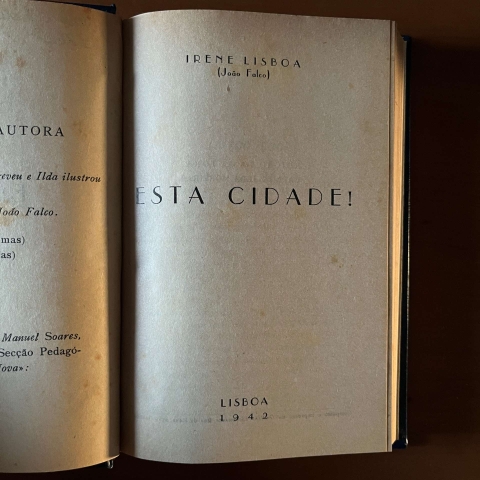 LISBOA (Irene) [Pseud. FALCO (João)].— ESTA CIDADE! Lisboa. 1942. [Gráfica Lisbonense]. In-8.º de 427-V págs. B. Edição da autora e um dos estimados e invulgares livros de Irene Lisboa, João Falco por pseudónimo, nome de raras e manifestas qualidades na literatura portuguesa contemporânea. Com interesse para um retrato de Lisboa: “Recolho neste volume umas tantas observações sôbre casos que conheci, que me pus a desfiar e a reconsiderar tranqüilamente. Tirei dêles novelas? Creio que não. Fiz dêles histórias pitorescas ou até morais? Também não creio. Pu-los simplesmente em letra redonda, contei-os. Contar ainda é um meio de dar corpo, um esbôço de estrutura se não estrutura completa aos assuntos. [...]. Ora eu não pretendi desta vez cultivar a novela nem o romance. Esquivei-me ao formalismo da sua composição e subordinei-me ao da observação desinteressada e a uns laivos de crítica. Assim contrariei a básica orientação romanesca: armar e tornar lógico para despertar o interêsse; embelezar ou afeiar para impressionar. A composição novelística ou romanesca implica a deformação e a teatrealização do pequeno nó da realidade. Torna-se o seu espêlho mágico. É um produto de arte, uma espécie de ilusionismo elegante, pelo que excede a modesta causa que muitas vezes a origina. A excede ou a sufoca, segundo os casos. “Mas tendo eu actualmente a curiosidade persistente do que me rodeia em vez de tentar o romance, isto é, a sua amplificação e derivações, lembrei-me de narrar. Porque hei-de eu romancear? Conto, exercito-me a analisar os casos e as criaturas. As qualidades literárias do romance podem-se tranportar para qualquer outro ramo da arte. Análise, compreensão, interêsse pela acção e pelo jôgo dos sentimentos tanto se podem exercer no romance como na simples narrativa.