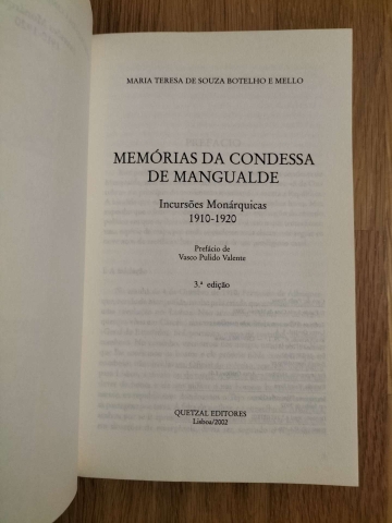 “As Memórias da Condessa de Mangualde são um documento inédito, abarcando o período das Incursões Monárquicas, de 1910 a 1920. Vamos encontrar nestas Memórias as angústias, incertezas e dificuldades por que passou a mulher de um dos mais convictos opositores monárquicos que recusara a indiferença e passividade geral perante a proclamação da República. Exilado,, encarcerado ou a monte, Fernando de Albuquerque, Conde de Mangualde, procurou sempre acompanhar e proteger a sua família, ainda que tal parecesse quase impossível.”