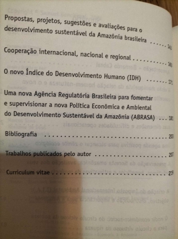 “A visão maniqueísta da relação homem-natureza e o novo conceito do Zênite ecológico e Nadir econômico-social. Os conceitos do desenvolvimento sustentável: suas dimensões e dificuldades operacionais. A preservação da floresta amazônica. A criação do Imposto Internacional Ambiental (I.I.A.): objetivo, distribuição e importância para a Amazônia. A grandeza continental da Amazônia: diversidades e peculiaridades de suas subregiões. Propostas, sugestões e avaliações para o desenvolvimento sustentável da Amazônia Brasileira. Cooperação internacional, nacional e regional. O novo Índice do Desenvolvimento Humano (IDH).”