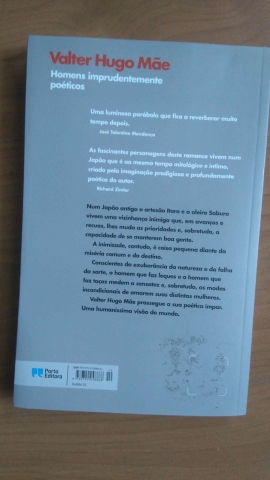 Sinopse: «Num Japão antigo, o artesão Itaro e o oleiro Saburo vivem uma vizinhança inimiga que, em avanços e recuos, lhes muda as prioridades e, sobretudo, a capacidade de se manterem boa gente. A inimizade, contudo, é coisa pequena diante da miséria comum e do destino. Conscientes da exuberância da natureza e da falha da sorte, o homem que faz leques e o homem que faz taças medem a sensatez e, sobretudo, os modos incondicionais de amarem suas distintas mulheres. Valter Hugo Mãe prossegue a sua poética ímpar. Uma humaníssima visão do mundo.»