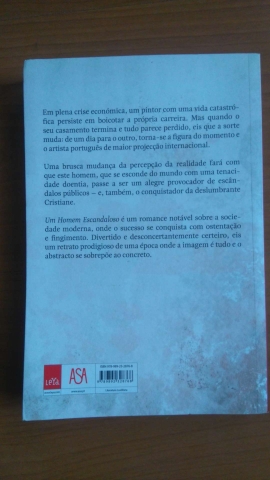 «Em plena crise económica, um pintor com uma vida catastrófica, persiste em boicotar a própria carreira. Mas quando o seu casamento termina e tudo parece perdido, eis que a sorte muda: de um dia para o outro, torna-se a figura do momento e o artista português de maior projecção internacional. Uma brusca mudança da percepção da realidade fará com que este homem, que se esconde do mundo com uma tenacidade doentia, passe a ser um alegre provocador de escândalos públicos - e, também, o conquistador da deslumbrante Cristiane. Um Homem Escandaloso é um romance notável sobre a sociedade moderna, onde o sucesso se conquista com ostentação e fingimento. Divertido e desconcertantemente certeiro, eis um retrato prodigioso de uma época onde a imagem é tudo e o abstracto se sobrepõe ao concreto.»