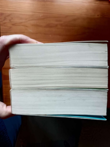 Só o primeiro é que tem um ligeiro vinco na lombada, mais na parte de baixo.