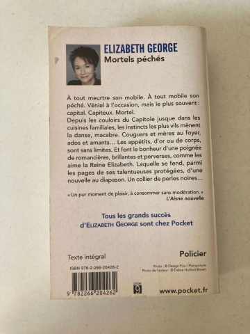 Sinopse (FR): Derrière chaque crime, n'y a-t-il pas toujours l'un des sept péchés capitaux ? La luxure et l'avarice sont le fil conducteur de ce recueil de vingt-trois nouvelles toutes écrites par des femmes, qu'Elizabeth George a choisies pour leur talent. A travers des intrigues plus diaboliques les unes que les autres, ces histoires, souvent drôles, parfois cruelles, pathétiques ou délicieusement perverses, montrent jusqu'où nos petites faiblesses peuvent nous mener. Si la mort n'est pas toujours au rendez-vous, la surprise, en revanche, est toujours de mise. Un pur moment de plaisir, à consommer sans modération, d'autant qu'Elizabeth George, la reine du crime en personne, a glissé l'une de ses créations parmi ces perles noires...