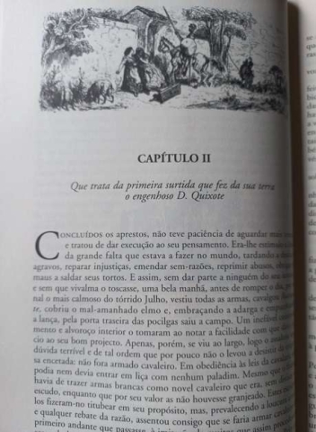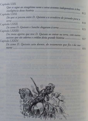 Considerado o primeiro romance moderno, D. Quixote de La Mancha foi eleito em 2002 o melhor livro de todos os tempos por um conjunto de cem escritores nomeados pelo Instituto Nobel. D. Quixote, um fidalgo de Castela assanhado pela leitura de romances de cavalaria, decide que é seu "ofício e exercício andar pelo mundo endireitando tortos, e desfazendo agravos" e parte à aventura na companhia de seu fiel e prosaico escudeiro, Sancho Pança. As hilariantes maluquices do Cavaleiro Andante liquidam, com a sua "moral do fracasso", as últimas ilusões da epopeia: aquilo a que Adorno chama "a ingenuidade épica". Depois de D. Quixote , nada mais será igual.