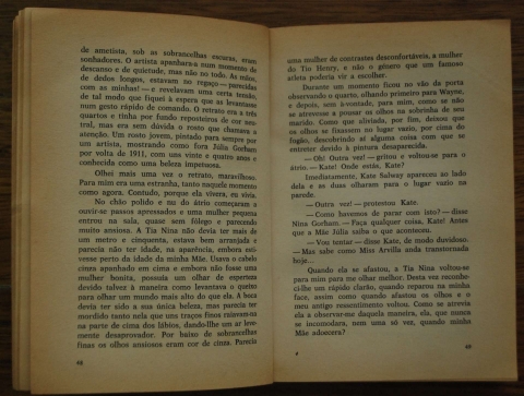 Abri a porta e desci os degraus da galeria entrando no hall dos espelhos, que me pareceu um mundo de confusão! Cem velas, ou talvez mil, brilhavam ao longo da sala, repetindo-se em espelhos e vidros sem fim numa miriade que se aproximava do infinito...Fiquei parada, tocada pelo terror, completamente perdida de medo...