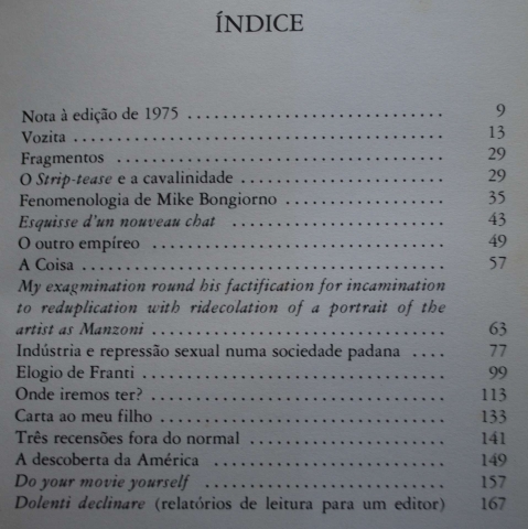 Na edição italiana, de 1983, a partir da qual foi feita a tradução que agora se publica, Umberto Eco eliminou certas crónicas de costumes excessivamente datadas e enriqueceu a secção de paródias literárias e «pastiches» com textos publicados ao longo dos últimos anos: as obras-primas do erotismo, apresentadas como livros para a «biblioteca das raparigas», os grandes textos da história da literatura avaliados por um leitor de manuscritos de uma editora contemporânea, entre outros.