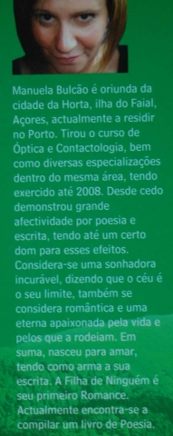 Manuela Bulcão nasceu na cidade da Horta, na Ilha do Faial, Açores. Atualmente reside em Vila Nova de Gaia, a sua terra de eleição. Conta com algumas publicações de poesia, em diversas coletâneas, e dois livros de poesia intitulados "Retalhos d'um Tempo" e "Este mar que nos une". O "Natal de Noélia" foi o seu primeiro conto infantil e o seu romance "A Filha de Ninguém" foi, sem dúvida, um marco na vida da autora. Manuela Bulcão é conhecida como uma mulher da cultura, sendo uma grande dinamizadora cultural na divulgação da língua de Camões. É também uma defensora de causas sociais em Portugal e além-fronteiras, abraçando o seu semelhante sempre de sorriso nos lábios.
