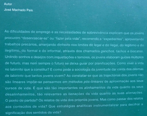 As dificuldades de emprego e as necessidades de sobrevivência explicam que os jovens procurem desenrascar-se ou fazer pela vida, recorrendo a expedientes, aproveitando trabalhos precários, arranjando dinheiro nos limites do legal e do ilegal, do legítimo e do ilegítimo, do formal e do informal, através dos chamados ganchos, tachos e biscates. Urdindo sonhos e desejos com inquietações e temores, os jovens elaboram guiões múltiplos de futuro, mas nem sempre o futuro se deixa guiar por planificações. Como viver a vida no labirinto que a constitui? E como pode a sociologia da juventude dar conta dos dilemas de labirinto que tantos jovens vivem?