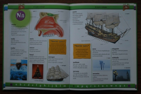 Entradas e definições cuidadosamente escolhidas, combinadas com uma série de quebra-cabeças e curiosidades, foram criadas para desenvolver capacidades vocabulares e gramaticais. Ao longo de todo o livro, grandes ilustrações com cores vivas são legendadas. ajudando a enfatizar o seu significado. No início de cada letra encontras desenhos giros e coloridos, na margem superior, correspondentes à letra em questão.