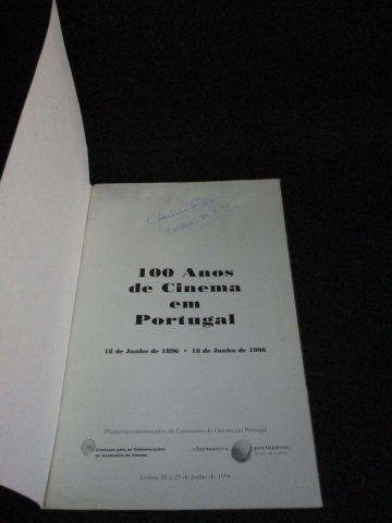 Assinatura de posse. 18 de Junho de 1896 a 18 e Junho de 1996. Capa de brochura. Organização de João Bénard da Costa. Textos João Bénard da Costa, José Manuel Costa, Filipe Boavida. Grafismo Guilherme Lopes Alves. Notas sobre a primeira exibição cinematográfica em Portugal, sobre a preservação do património cinematográfico português pela Cinemateca Portuguesa e sobre o restauro do filme “O Destino”.