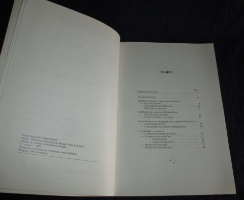 Do índice: Apresentação; Resumo histórico; Estrutura interna e plano das instalações; Catálogo das espécies bibliográficas; A classificação e a arrumação das espécies bibliográficas; O utilizador e a leitura.