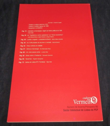 Do índice: Prefácio à edição alemã de 1872 do Manifesto do Partido Comunista; Prefácio à edição inglesa de 1888 do Manifesto do Partido Comunista; Burgueses e Proletários; Liberdade e emancipação: viagem por textos políticos de 1848 (Pedro Maia); do "Capitalismo contra capitalismo" ao "Horror económico" (José Barata-Moura, Isabel Esteves e Sérgio Ribeiro); Lucidez e Cegueira - a propósito de Brecht (Maria Helena Serôdio); As 5 dificuldades de escrever a verdade (Bertolt Brecht); Tricky conforta um cidadão; Ciência e Tecnologia (Rui Namorado Rosa); Um, dois passos atrás (Lurdes Silva); Notas sobre o Fantasma (Fernando Guerreiro); Teoremas (Rogério Gonçalves); Verbos de Lisboa nº 4: Tumultuar (Filipe Diniz).
