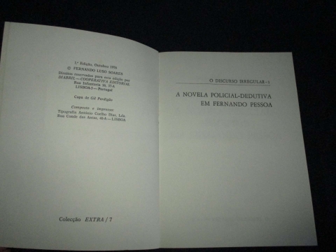 Do índice: I. O decifrador quaresma e "o roubo na quinta das vinhas"; II. A determinação psicológica do criminoso e "a carta mágica"; III. A determinação psicológica do criminoso e "o caso Vargas"; Introdução ao estudo da inteligência e da sensibilidade em Fernando Pessoa.