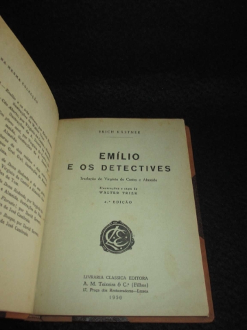 Encadernação meia francesa com lombada e cantos em pele. Ferros e títulos gravados a ouro na lombada. Não preserva as capas de brochura. Tradução de Virgínia de Castro e Almeida. Ilustrações de Walter Trier. Clássico absoluto da literatura infantil europeia, Emílio e os Detectives acompanha a aventura de um rapaz que, após ser roubado durante uma viagem, reúne um grupo de crianças para capturar o ladrão. O engenho narrativo de Erich Kästner posto ao serviço da curiosidade e do gosto que os jovens têm de ler histórias que os divirtam e façam pensar. Esta sua obra é considerada um clássico da literatura juvenil.