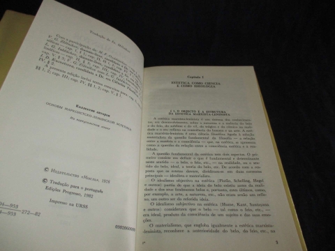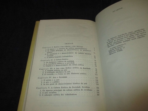 Do índice: Estética como ciência e como Ideologia; A Cultura Estética; A arte como reflexo artístico da realidade; Arte e Sociedade, A Cultura Estética da Sociedade Socialista.