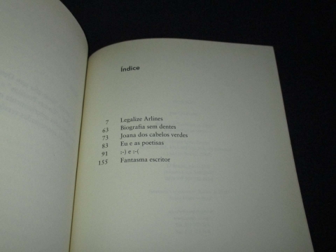 "Este livro tem os contos absolutamente inéditos "Legalize Airlines" e ":-) e :-(". Além destes, tem versões corrigidas e aumentadas de "Biografia sem dentes", "Joana dos cabelos verdes", "Eu e as poetisas" e "Fantasma escritor"."