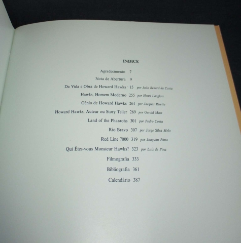 Textos de João Bénard da Costa; Henri Langlois; Jacques Rivette; Gerald Mast; Pedro Costa; Jorge Silva Melo; Joaquim Pinto & Luis de Pina. Iclui filmografia & bibliografia do realizador Howard Hawks.
