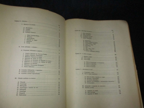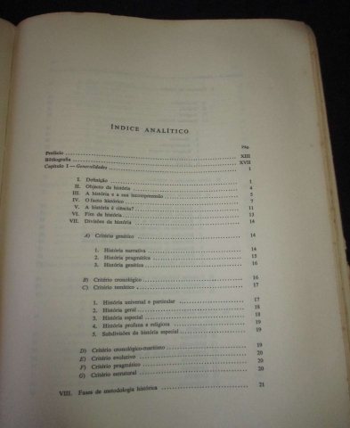 Do índice: Generalidades; Heurística; Metodologia da Heurística; A crítica em história; Metodologia da crítica; A síntese histórica; Metodologia da síntese histórica; Noções sobre a filosofia e a teologia da história.