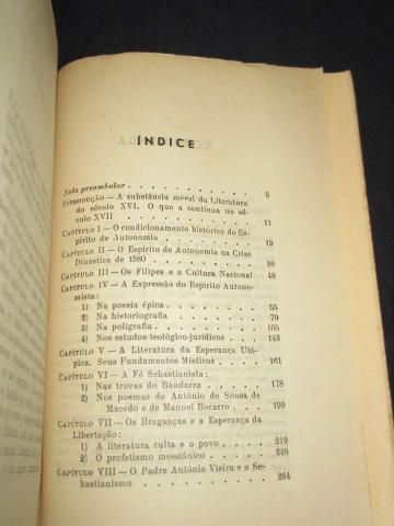 Contém nota preambular, introdução, a obra propriamente dita com oito capítulos e, nas páginas finais, aditamento, índice e corrigenda. Inclui capítulos sobre o Padre António Vieira e sobre o Sebastianismo.