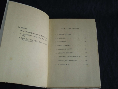 Primeira edição deste livro em prosa, constituído pelos seguintes capítulos/ensaios: A Solidão e o Amor; A Saudade; O Labirinto; O Riso e o Choro; A Beleza e o Caos; A Palavra Simbólica; A Dinâmica da Contemplação; A Evolução Hierárquica; A Serenidade.