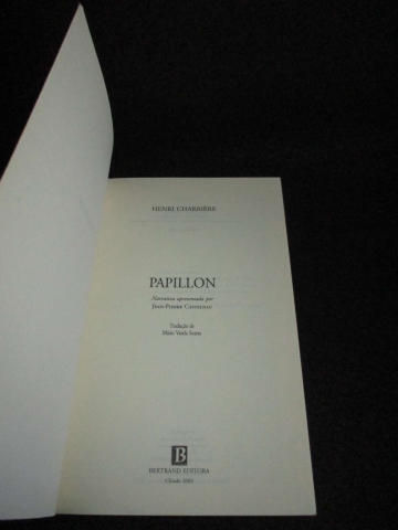 Capa de brochura. Narrativa apresentada por Jean-Pierre Castelnau. Tradução de Mário Varela Soares. Uma espantosa história de coragem, uma narrativa emocionante da odisseia de um homem inocente para derrotar a injustiça. Condenado a prisão perpétua numa colónia penal, Papillon não se conforma com o seu destino. Determinado a escapar e sem se deixar abater pelas condições brutais em que se encontra detido, durante treze anos vai tentando por diversas vezes a fuga em busca da liberdade que lhe fora injustamente retirada.