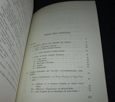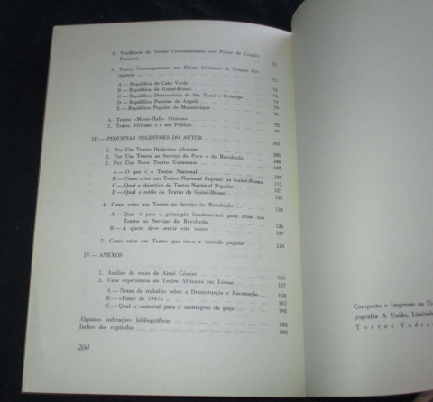 Do índice: História Breve do Teatro em África; Visão Sumária do Teatro Contemporâneo Africano; Pequenas Sugestões do Autor; Anexos.