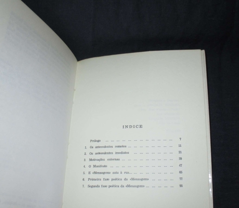Do índice: Prólogo; Os antecedentes remotos; Os antecedentes imediatos; Motivações externas; O Manifesto; E Mensagem saiu à rua; Primeira fase poética da Mensagem; Segunda fase poética da Mensagem.