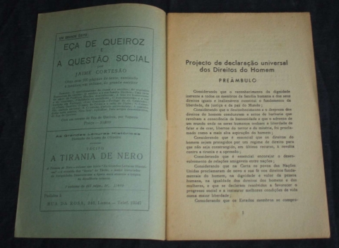 Primeira publicação da Declaração dos direitos humanos, brochura com 8 páginas. Portugal só a adoptou e integrou na Constituição em 1978.