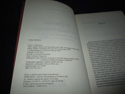Esgotado no editor. Nações e Nacionalismo desde 1780, programa, mito, realidade. "Um dos aspectos centrais da história universal - e mais caracteristicamente da história europeia - dos últimos cento e vinte anos tem sido a questão do nacionalismo. Para além de todas as transformações políticas - e algumas, como a formação e a desagregação da URSS, foram de imensas repercussões -, subsiste manifestamente, em muitas zonas do globo, o problema da identidade nacional em contraposição ao problema da integração num Estado plurinacional."