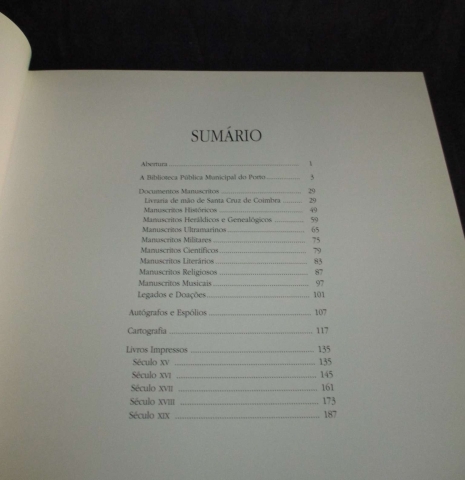 Encadernação editorial em tela verde com título e autores a seco na pasta anterior e sobrecapa policromada. Muito ilustrado com excelentes reproduções de documentos únicos que se encontram à guarda da Biblioteca, muito bem impressas a cores sobre papel couché de elevada qualidade. Documenta e analisa pormenorizadamente a extensão e riqueza do espólio da Biblioteca Municipal do Porto, traçando um itinerário histórico desta importante instituição. Contém informação referente a manuscritos, cartografia e bibliografia. Estamos perante a maior e a mais antiga biblioteca pública municipal portuguesa e uma das três principais bibliotecas do nosso país.