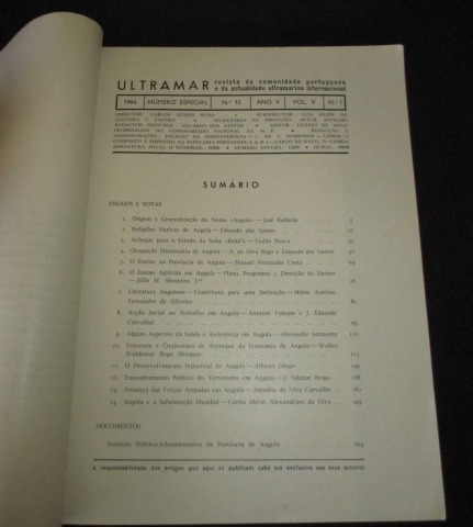 Do índice: Origem e Generalização do Nome Angola (José Redinha); Religiões Nativas de Angola (Eduardo dos Santos); Achegas para o Estudo da Seita Bahá´i (Fialho Ponce); Ocupação Missionário de Angola (A. da Silva Rego e Eduardo dos Santos); O Ensino na Província de Angola (Manuel Fernandes Costa); O Ensino Agrícola em Angola (Júlio M. Monteiro Jr); Literatura Angolana (Mário António Fernandes de Oliveira); Acção Social no Trabalho em Angola (Antunes Valente, J. Eduardo Carvalhal); Alguns Aspectos da Saúde e Assistência em Angola (Alexandre Sarmento); Estrutura e Conjuntura de Arranque da Economia de Angola (Walter Waldemar Rego Marques); O Desenvolvimento Industrial de Angola (Alberto Diogo); Enquadramento Político do Terrorismo em Angola (J. Salazar Braga); Presença das Forças Armadas em Angola (Amadeu da Silva Carvalho); Angola e a Informação Mundial (Carlos Mário Alexandrino da Silva. Estatuto Político-Administrativo da Província de Angola).